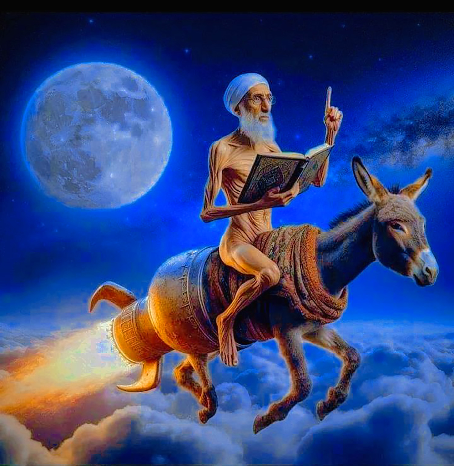 The artwork depicts an elderly, scholarly-looking man riding a donkey across a glowing night sky, framed by clouds and a luminous full moon. What makes the scene instantly surreal is the fusion of ancient imagery with futuristic elements—the donkey appears to be propelled by a rocket-like engine, streaking fire as it soars above the world. The man holds an open book, poised in a gesture that suggests teaching, discovery, or divine inspiration, creating a juxtaposition between timeless wisdom and fantastical travel.